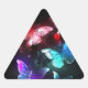 Three luminous, red, purple, green, textured, night butterflies on black luminous background.