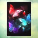 Three luminous, red, purple, green, textured, night butterflies on black luminous background.