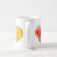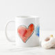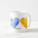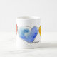 Three watercolor hearts on a coffee mug. Golden yellow, true blue and bright red. PERSONALIZE by hitting the customise button. Add your own custom message, choose from several fonts, from formal to casual. Change the style of mug, get accent colours or the heat disappearing mug.