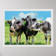 Linda Baysinger Peck’s digitally enhanced painterly, impasto look photograph of three black and white Holstein cows in a grassy pasture, with a cornfield and blue sky with white clouds behind them. The cows are eating grass and one thinks the other cow’s grass is better. Beautifil country image.