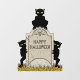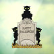 Three shadowy green-eyed black imps lurk around an old headstone engraved with a winged skull and the words "Happy Halloween" in this original spooky-but-fun Halloween illustration by Richard H. Fay.