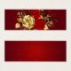 The composition of two artistically painted red roses and one golden rose, decorated with gold, jewel leaves on textured background.