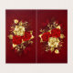 The composition of two artistically painted red roses and one golden rose, decorated with gold, jewel leaves on textured background.