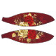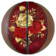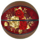 The composition of two artistically painted red roses and one golden rose, decorated with gold, jewel leaves on textured background.
