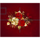 The composition of two artistically painted red roses and one golden rose, decorated with gold, jewel leaves on textured background.