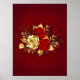 The composition of two artistically painted red roses and one golden rose, decorated with gold, jewel leaves on textured background.