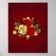 The composition of two artistically painted red roses and one golden rose, decorated with gold, jewel leaves on textured background.