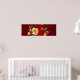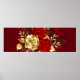 The composition of two artistically painted red roses and one golden rose, decorated with gold, jewel leaves on textured background.