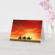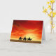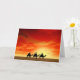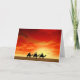 A stunningly dramatic Christmas card with the three kings travelling on camels through the desert with an amazing desert sunset behind.