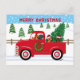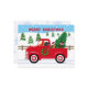Three Labradors Red Truck Christmas Holiday postcard for Labrador Owners. Festive image of Black Labrador driving his/her vintage Red Truck on the way to home with Christmas Tree on the truck bed. He also have friends on the truck, they are Chocolate Labrador and Fox Red Labrador. Cute Labrador Cartoon Art created by Naomi Ochiai.