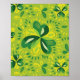 Three leaf clovers pattern poster with an abstract vector illustration of clovers in fresh yellow and green colors and many decorative elements around them. Though, contrary from their four-leaf siblings, these fun flowers are not considered lucky, they are as pretty and beautiful as every botanical part of nature that flourishes in the spring season.