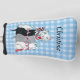 This custom golf club cover for your putters has three little kittens in colours of black, white, and grey with their white mother cat all with pink bows on a background of blue and white plaid. Customise your name with the template.