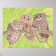 Funny, realistic acrylic painting of three super cute little, big eyed, scowling Screech owlets sitting close together on a branch, against a backdrop of bright green leaves. These cheeky young owls should melt the heart of any bird lover and bring a smile to the face of everyone else.
