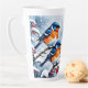 Three cute little birds perch on a snowy branch, surrounded by bright, red berries, as snow falls gently around them. Very charming and beautiful holiday latte mug.