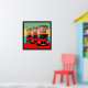 Print of a double-decker red bus of London photographed in 1995, treated graphically to extract the background of the photo and the bus image duplicated three times to show a row of buses. The background is composed of bold bands of color - jade blue, yellow, red and green. The border is black. This print will make a splash of color on the wall but more importantly it shows the iconic London bus from one of the greatest cities in the world.
