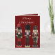 This Christmas card features three colourful, traditional, wooden Christmas Nutcracker soldiers, one with an axe, one with cymbals, and one with a sword. The background is dark red, with editable text so it can be made truly personal.