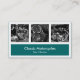 A business card template with three photo windows on the front and one on the back. This version has square black and white photos showing details of classic motorcycles. Company details on the front with name and contact details on the reverse on a variation of the front design.