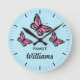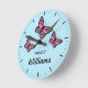 This clock features three beautiful illustrations of pink butterflies on a blue background colour. The clock face is made of simple and stylish black lines.