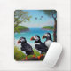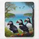 Pictured In A Oil Paint Design Are Three Puffins On A Tree Branch Overlooking The Ocean.