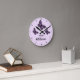 This clock features three beautiful illustrations of purple butterflies on a lilac background colour. The clock face is made of simple and stylish black lines. There is also text that reads "Family" with a customisable text area for the name.