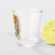This shot glass is perfect for Halloween fun! There are three skeleton's dancing and it says "Let's Get Halloweird". It's set against a watercolor orange and grey background.