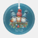 A round all glass ornament with a blue snowflake background and three little songbirds on a branch, in winter hats