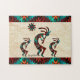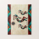 Enjoy this Unique Southwest Kokopelli Puzzle! It Features Three Southwest Kokopelli Dancing and Playing the Flute Under the Sun on a Tan Sandstone Background...Surrounded by a Southwest Border in Turquoise, Orange and Black!