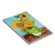 Three Sunflowers (1888) by Vincent van Gogh is a vibrant still life that showcases the artist’s signature thick brushstrokes and bold use of colour. The painting features three sunflowers in a simple vase, their golden petals contrasting against the aqua blue background. Van Gogh's vivid yellow palette brings energy and life to the scene, capturing the fleeting beauty of the flowers. This piece is part of a series of sunflower paintings created by the artist, highlighting his fascination with the flower as a symbol of life, vitality, and transience.