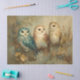 A trio of owls; one teal, one rust, and one golden, perch gracefully on a leafy branch in this softly textured, painterly design. The gentle, earthy palette and vintage-inspired strokes create an enchanting woodland scene perfect for nature-themed decoupage, paper crafts, or autumn decor projects.