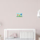 Fun watercolor painting of three whimsical birds in blue and purple with long skinny legs standing on green grass.