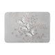 Bath mat with my pretty vector design of three white and black butterflies flying over airy bubbles of grey and white with touches of peach, on a grey background.