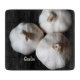A dramatic decorative glass cutting board with 3 white Garlic bulbs tastefully arranged and contrasting against a black background. The whole cloves of garlic are highlighted against dark shadows. The word garlic may be changed to personalise this cutting board with a Family Name or any text you wish. The herbal still life photography has a dramatic feel as well as a rustic feel ideal for any country kitchen. Both decorative and functional, this culinary display makes an ideal gift for a housewarming or for Your favourite cook or gourmet chef.