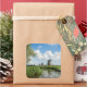 Souvenir photo sticker of three windmills along a canal with boats and reeds under a blue sky with puffy clouds creating a peaceful scene in the dutch countryside of Leidschendam, the Netherlands.
