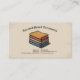 A cream color background vintage-style business card for a thrift store or business featuring a stack of neatly folded, textiles, with visible stitching details, in warm mustard yellow and faded denim blue and red. Perfect for a second-hand or used clothes shop or business.