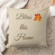 This throw pillow is shown in a beige neutral colour with a Bless This Home text print with a pretty fall leaf accent.