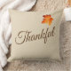This throw pillow is shown in a natural colour with a Thanksgiving Thankful text print with a pretty fall leaf accent.
