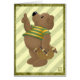 A whimsical bear wearing a green and yellow striped top and carrying a basket covered with a tartan cloth, containing goodies for the birthday party I guess. With the right paw the cute bear gives a "thumbs up". A design not just for birthdays, for big and small bearlovers!