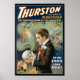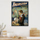 This 1915 advertising poster is of Howard Thurston. The poster is titled "Do spirits come back?" In this poster Thurston is holding a human skull and from it comes a cloud of green smoke filled with spirits.
