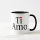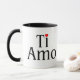 Simple and elegant white ceramic mug with a black handle and black interior, featuring “Ti Amo” in a clean serif font, accented by a small red heart dotting the “i” for a subtle romantic touch—perfect for coffee or tea lovers, anniversaries, weddings, Valentine’s Day, or anyone who appreciates minimalist design infused with timeless Italian love.