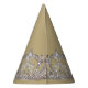 This party hat is shown in a champagne-taupe-gold type color background and a silver and pearl tiara print all the way around. Text in coordinating color of white states Happy New Year.