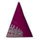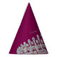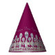 This party hat is shown in a deep fuchsia-plum wine background and a silver crystal tiara print on the front, tapering to the sides. Plain back. Text in coordinating color of silver-gray states Happy New Year.