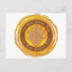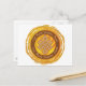 Endless Knot Buddhist design with yellow and orange circular grunge strokes with Om Mani Padme Hum in elegant surrounding text. In the inner brown circle is larger Om Mani Padme Hum text. In the centre with a backing of enlightened rays is an Endless Knot symbol, one of the Eight Auspicious Symbols of Buddhism.