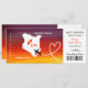 A fun but stylish wedding invitation in a boarding pass/ticket style for couples getting married abroad in Kenya, East Africa which is shown in a white map silhouette on a sunset orange yellow purple toned background with sweet love hearts, air plane silhouette and white beads swirling into a heart shape. The reverse of the boarding pass has two giraffe silhouettes in front of a bright sunset.