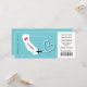 A fun but stylish wedding invitation in a boarding pass/ticket style for couples getting married abroad in California which is shown in a white map silhouette on pale teal blue with sweet red love hearts, aeroplane silhouette and white swirling heart shape. The reverse has a space for your photo and contact/RSVP details