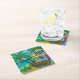 A painting by Lisa Lorenz of a vibrant, blissful tropical scene of a colourful cosy beach house along a turquoise seashore beach. Now available on a a set of coasters to liven up your Bar.