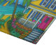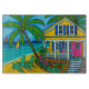 A painting by Lisa Lorenz of a vibrant, blissful tropical scene of a colourful cosy beach house along a turquoise seashore beach. Now available on a cutting board.