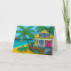 A painting by Lisa Lorenz of a vibrant, blissful tropical scene of a colourful cosy beach house along a turquoise seashore beach. Now available on a Greeting Card. Send this card to someone that loves the beach.