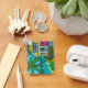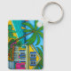 A painting by Lisa Lorenz of a vibrant, blissful tropical scene of a colourful cosy beach house along a turquoise seashore beach. Now available on a keychain.