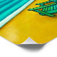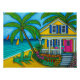 A painting print by Lisa Lorenz of a vibrant, blissful tropical scene of a colourful cosy beach house along a turquoise seashore beach.