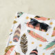 Tickle me pink, teal, black and gold with this cute feather pattern beach towel! Boho style pattern feathers in colours of salmon pink, teal green, black and gold dance across a background of white. Little gold dots are scattered about to add interest. Unique and attractive!